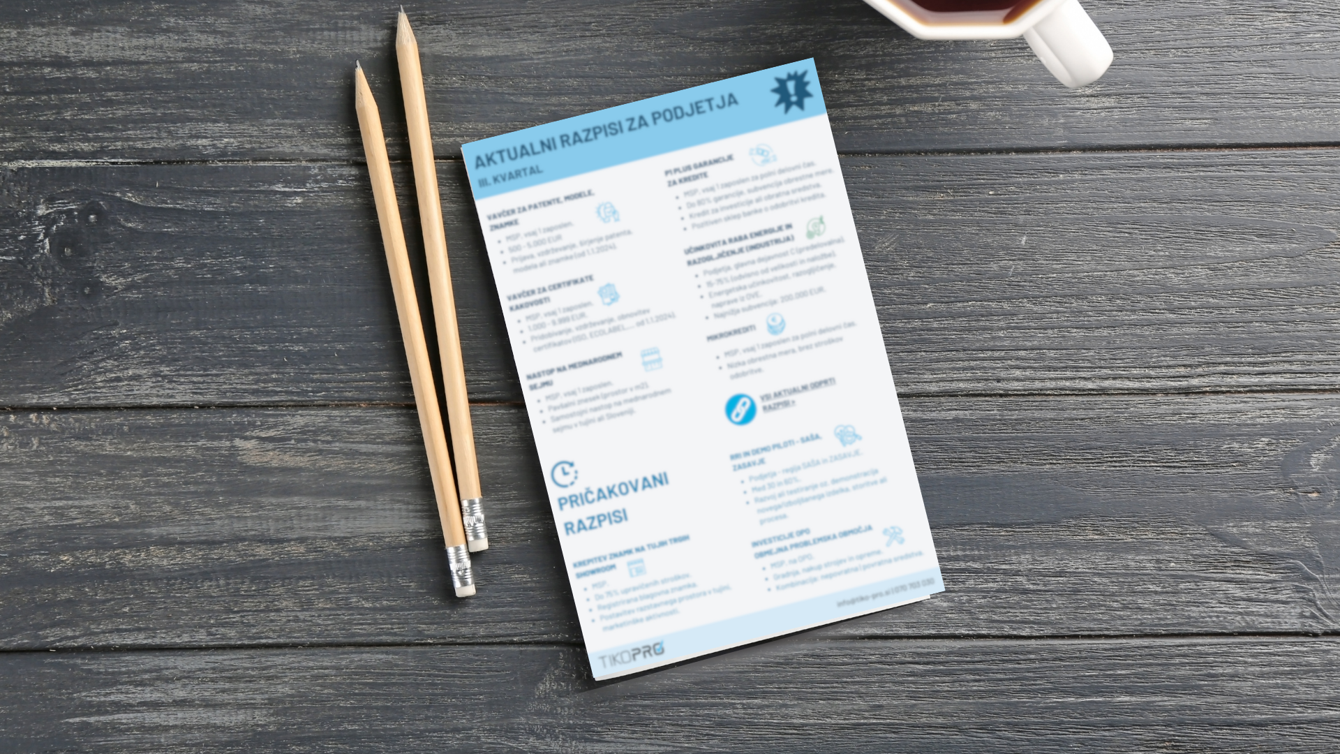 Aktualni in napovedani razpisi v 3. kvartalu leta Iščete priložnosti za rast s pomočjo nepovratnih sredstev in ugodnih financiranj? Datum objave: 11. 09. 2024 Aktualni in pričakovani razpisi za podjetja v 3. kvartalu 2024! Za vas smo pripravili kratek pregled aktualnih in napovedanih razpisov za tretji kvartal 2024, ki vključujejo sofinanciranja za certifikate kakovosti, patente, nastope na mednarodnih sejmih, pa tudi možnosti za sofinanciranje naložb v energetsko učinkovitost in razogljičenje. Kateri razpisi so trenutno na voljo in kaj še lahko pričakujemo v jesenskih mesecih? Oglejte si vse aktualne in napovedane razpise: PRENOS BROŠURE Ne zamudite priložnosti, da svoj projekt uresničite s pomočjo razpisnih sredstev! Potrebujete pomoč pri prijavi na razpise? KONTAKTIRAJTE NAS Trebate li našu pomoć prilikom pridobivanja sredstava? Pošaljite nam upit i porazgovarati ćemo o mogućnostima suradnje. Kontaktirajte nas